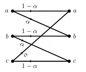 The transition diagram of a discrete memoryless channel with three input symbols and three output symbols is shown in the figure. The transition probabilities are as marked.