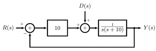 The block diagram of a closed-loop control system is shown in the figure. R(s), Y(s), and D(s) are the Laplace transforms of the time-domain signals r(t), y(t), and d(t), respectively. Let the error signal be defined as e(t) = r(t) − y(t). Assuming the reference input r(t) = 0 for all t, the steady-state error e(∞), due to a unit step disturbance d(t), is _________ (rounded off to two decimal places).