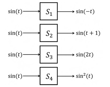 The outputs of four systems (S1, S2, S3, and S4) corresponding to the input signal sin(t), for all time t, are shown in the figure.