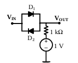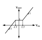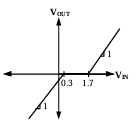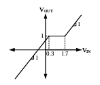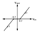 In the circuit shown below, D1 and D2 are silicon diodes with cut-in voltage of 0.7 V. VIN and VOUT are input and output voltages in volts. The transfer characteristic is