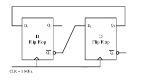In a given sequential circuit, initial states are Q1 = 1 and Q2 = 0. For a clock frequency of 1 MHz, the frequency of signal Q2 in kHz, is ____ (rounded off to the nearest integer).