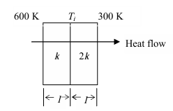 Heat transfer through a composite wall is shown in figure. Both the sections of the wall have equal thickness (l). The conductivity of one section is k and that of the other is 2k. The left face of the wall is at 600 K and the right face is at 300 K. The interface temperature Ti (in K) of the composite wall is ________.
