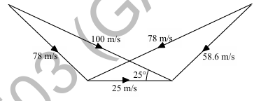 At the inlet of an axial impulse turbine rotor, the blade linear speed is 25 m/s, the magnitude of absolute velocity is 100 m/s and the angle between them is 25°. The relative velocity and the axial component of velocity remain the same between the inlet and outlet of the blades. The blade inlet and outlet velocity triangles are shown in the figure. Assuming no losses, the specific work (in J/kg) is ________.