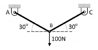 Two identical trusses support a load of 100 N as shown in the figure. The length of each truss is 1.0 m; cross-sectional area is 200 mm2; Young's modulus E = 200 GPa. The force in the truss AB (in N) is ________.
