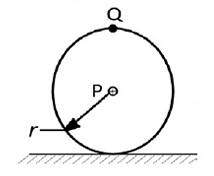 A wheel of radius r rolls without slipping on a horizontal surface shown below. If the velocity of point P is 10 m/s in the horizontal direction, the magnitude of velocity of point Q (in m/s) is ________.