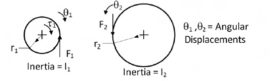 A pinion with radius r1, and inertia I1 is driving a gear with radius r2 and inertia I2. Torque τ1 is applied on pinion. The following are free body diagrams of pinion and gear showing important forces (F1 and F2) of interaction. Which of the following relations hold true?