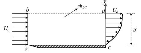 A steady laminar boundary layer is formed over a flat plate as shown in the figure. The free stream velocity of the fluid is Uo. The velocity profile at the inlet a-b is uniform, while that at a downstream location c-d is given by u = Uo[2(y/δ) - (y/δ)2].