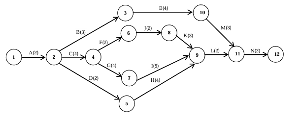 A project consists of 14 activities, A to N. The duration of these activities (in days) are shown in brackets on the network diagram. The latest finish time (in days) for node 10 is ________.