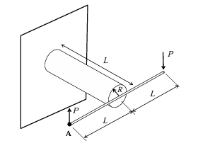 A rigid horizontal rod of length 2L is fixed to a circular cylinder of radius R as shown in the figure. Vertical forces of magnitude P are applied at the two ends as shown in the figure. The shear modulus for the cylinder is G and the Young's modulus is E.