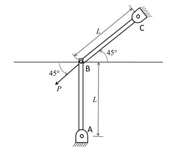 In the figure, the load P = 1 N, length L = 1 m, Young's modulus E = 70 GPa, and the cross-section of the links is a square with dimension 10 mm x 10 mm. All joints are pin joints.