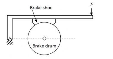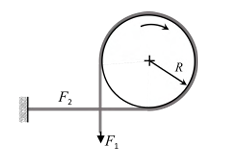The forces F1 and F2 in a brake band and the direction of rotation of the drum are as shown in the figure. The coefficient of friction is 0.25. The angle of wrap is 3π/2 radians. It is given that R = 1 m and F2 = 1 N. The torque (in N-m) exerted on the drum is ________.