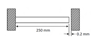 A circular metallic rod of length 250 mm is placed between two rigid immovable walls as shown in the figure. The rod is in perfect contact with the wall on the left side and there is a gap of 0.2 mm between the rod and the wall on the right side. If the temperature of the rod is increased by 200°C, the axial stress developed in the rod is ________ MPa. Young's modulus of the material of the rod is 200 GPa and the coefficient of thermal expansion is 10-5 per °C.