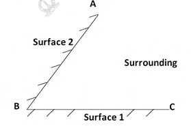 Two black surfaces, AB and BC, of lengths 5 m and 6 m, respectively, are oriented as shown. Both surfaces extend infinitely into the third dimension. Given that view factor F₁₂ = 0.5, T₁ = 800K, T₂ = 600K, T_surrounding = 300K and Stefan Boltzmann constant, σ = 5.67 × 10⁻⁸ W/(m²K⁴), the heat transfer rate from Surface 2 to the surrounding environment is ________ kW.