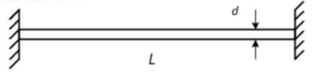 An initially stress-free massless elastic beam of length L and circular cross-section with diameter d (d << L) is held fixed between two walls as shown. The beam material has Young's modulus E and coefficient of thermal expansion α. If the beam is slowly and uniformly heated, the temperature rise required to cause the beam to buckle is proportional to