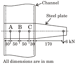 A steel plate, connected to a fixed channel using three identical bolts A, B and C, carries a load of 6 kN as shown in the figure. Considering the effect of direct load and moment, the magnitude of resultant shear force (in kN) on bolt C is