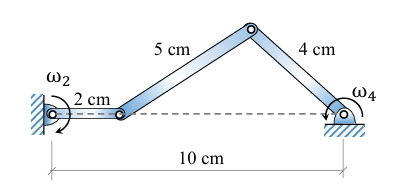 In the configuration of the planar four-bar mechanism at a certain instant as shown in the figure, the angular velocity of the 2 cm long link is ωH = 5 rad/s. Given the dimensions as shown, the magnitude of the angular velocity ωH of the 4 cm long link is given by _____ rad/s (round off to 2 decimal places).