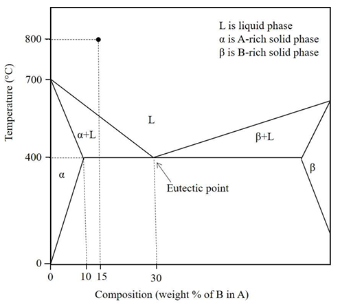 Fluidity of a molten alloy during sand casting depends on its solidification range. The phase diagram of a hypothetical binary alloy of components A and B is shown in the figure with its eutectic composition and temperature. All the lines in this phase diagram, including the solidus and liquidus lines, are straight lines. If this binary alloy with 15 weight % of B is poured into a mould at a pouring temperature of 800 ºC, then the solidification range is