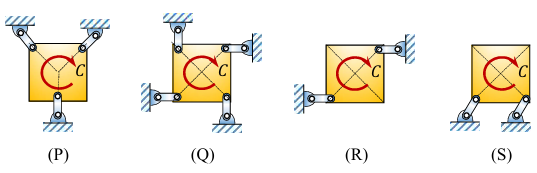A square plate is supported in four different ways (configurations (P) to (S) as shown in the figure). A couple moment 𝐶 is applied on the plate. Assume all the members to be rigid and mass-less, and all joints to be frictionless. All support links of the plate are identical.