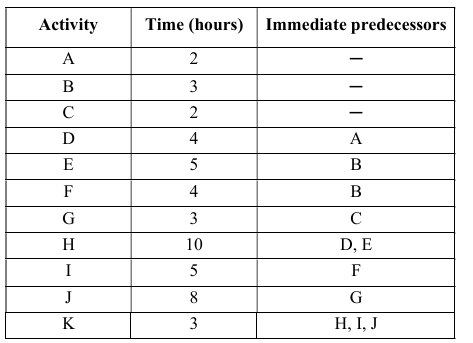 Activities A to K are required to complete a project. The time estimates and the immediate predecessors of these activities are given in the table. If the project is to be completed in the minimum possible time, the latest finish time for the activity G is ____________ hours.
