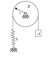 The system shown in the figure consists of block A of mass 5 kg connected to a spring through a massless rope passing over pulley B of radius r and mass 20 kg. The spring constant k is 1500 N/m. If there is no slipping of the rope over the pulley, the natural frequency of the system is ________ rad/s.