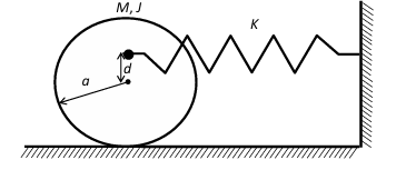 A solid disc with radius a is connected to a spring at a point d above the center of the disc. The other end of the spring is fixed to the vertical wall. The disc is free to roll without slipping on the ground. The mass of the disc is M and the spring constant is K. The polar moment of inertia for the disc about its centre is J = Ma2/2.