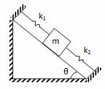 What is the natural frequency of the spring mass system shown below? The contact between the block and the inclined plane is frictionless. The mass of the block is denoted by m and the spring constants are denoted by k1 and k2.