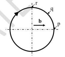 The figure shows a dislocation loop (shown by the solid circle), whose Burgers vector is b (shown by the horizontal arrow inside the dislocation loop). Identify the nature of the dislocation segment at locations p, q and r.