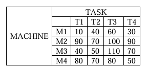 A workshop has four tasks and equal number of machines to perform the tasks. Each of the machines can perform only one of the four tasks. The estimated cost at each of the machines to complete each task is given in table