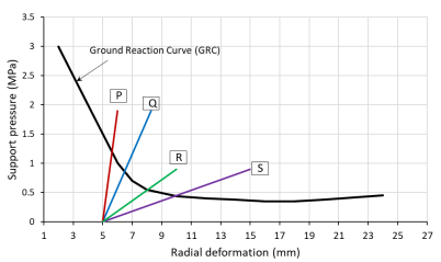 If the lining is constructed after 5 mm radial deformation, the support reaction is best represented by the line