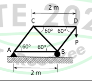A five-member truss system is shown in the figure. The maximum vertical force P in kN that can be applied so that loads on the member CD and BC do NOT exceed 50 kN and 30 kN, respectively is ______ (rounded off to 2 decimal places)