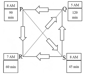 Four cities P, Q, R, and S are connected through one-way routes as shown in the figure. The travel time between any two connected cities is one hour. The boxes beside each city name describe the starting time of the first train of the day and their frequency of operation. For example, from city P, the first trains of the day start at 8 AM with a frequency of 90 minutes to each of R and S. A person does not spend additional time at any city other than the waiting time for the next connecting train. If the person starts from R at 7 AM and is required to visit S and return to R, what is the minimum time required?