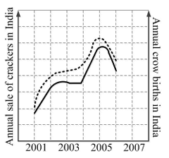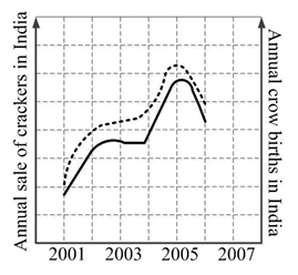In a detailed study of annual crow births in India, it was found that there was relatively no growth during the period 2002 to 2004 and a sudden spike from 2004 to 2005. In another unrelated study, it was found that the revenue from cracker sales in India which remained fairly flat from 2002 to 2004, saw a sudden spike in 2005 before declining again in 2006. The solid line in the graph below refers to annual sale of crackers and the dashed line refers to the annual crow births in India. Choose the most appropriate inference from the above data.