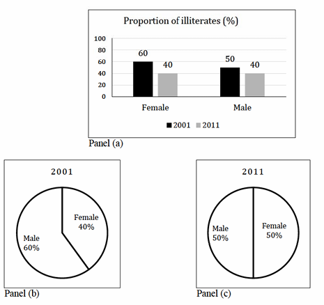 The bar graph in Panel (a) shows the proportion of male and female illiterates in 2001 and 2011. The proportions of males and females in 2001 and 2011 are given in Panel (b) and (c), respectively. The total population did not change during this period. The percentage increase in the total number of literates from 2001 to 2011 is