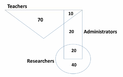 n the given diagram, teachers are represented in the triangle, researchers in the circle and administrators in the rectangle. Out of the total number of the people, the percentage of administrators shall be in the range of _________.