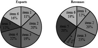 The total exports and revenues from the exports of a country are given in the two pie charts below. The pie chart for exports shows the quantity of each item as a percentage of the total quantity of exports. The pie chart for the revenues shows the percentage of the total revenue generated through export of each item. The total quantity of exports of all the items is 5 lakh tonnes and the total revenues are 250 crore rupees. What is the ratio of the revenue generated through export of Item 1 per kilogram to the revenue generated through export of Item 4 per kilogram?