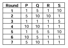 Four archers P, Q, R and S try to hit a bull's eye during a tournament consisting of seven rounds.