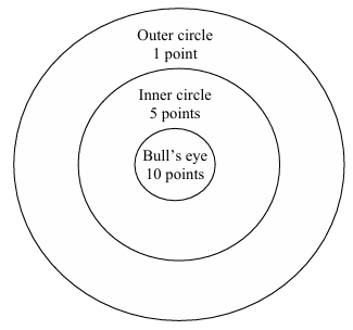 As illustrated in the figure below, a player receives 10 points for hitting the bulls' eye, 5 points for