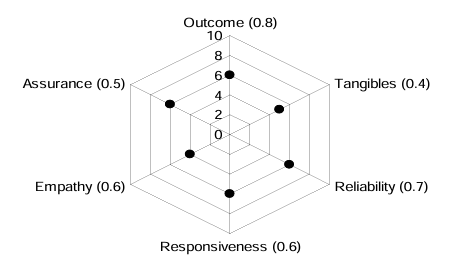 The quality of services delivered by a company consists of six factors as shown below in the radar diagram. The dots in the figure indicate the score for each factor on a scale of 0 to 10. The standardized coefficient for each factor is given in the parentheses. The contribution of each factor to the overall service quality is directly proportional to the factor score and its standardized coefficient.