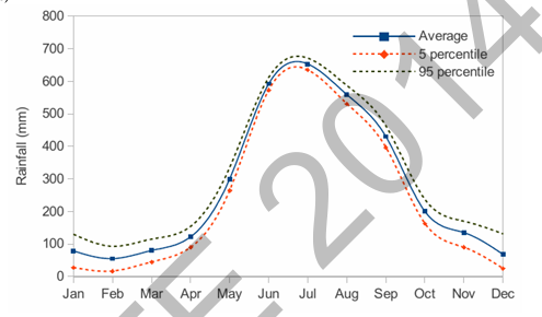 The monthly rainfall chart based on 50 years of rainfall in Agra is shown in the following figure.