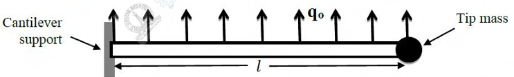 An aircraft wing is idealized as a cantilever beam of constant width and length I with a tip mass of weight W (Newtons) and has a uniformly distributed loading of qo (Newtons/m) as shown in the figure. Flexural rigidity =EI and qo l=10 W.