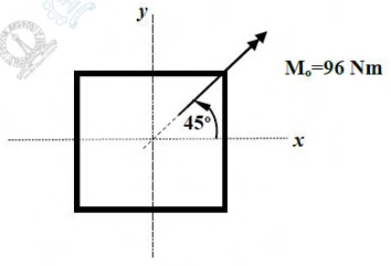 The maximum normal stress in MN/m2 for the thin walled beam of square cross section of outer dimension 120 mm x 120 mm and wall thickness 1 mm under the action of moment M0=96 Nm as shown in the figure is _______ (in three decimal places).