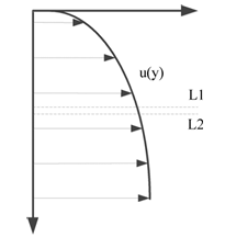 Consider the velocity distribution, u(y) shown in the figure. For two adjacent fluid layers L1 and L2, the viscous force exerted by L1 on L2 is _______.