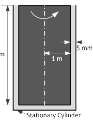 Consider a solid cylinder housed inside another cylinder as shown in the figure. The radius of the inner cylinder is 1 m and its height is 2 m. The gap between the cylinders is 5 mm and is filled with a fluid of viscosity 10-4 Pa-s. The inner cylinder is rotating at a constant angular speed of 5 rad/s while the outer cylinder is stationary. Friction at the bottom surfaces can be ignored. The velocity profile in the vertical gap between the cylinders can be assumed to be linear. The driving moment required for the rotating motion of the inner cylinder is _______ Nm. (rounded off to two decimal places)