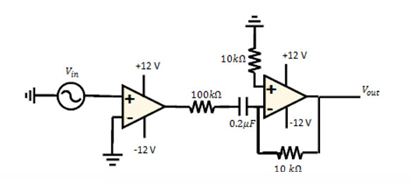 For the given input voltage, Vin = 10 sin(2πt) to the functional circuit shown below, the output signal will be _______.