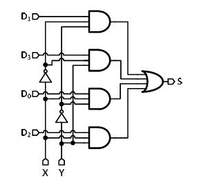Input bits X and Y are added by using the combinational logic as shown below. S represents the sum of the two bits. For a correct implementation of the sum, the signals D0, D1, D2, D3 are _______, _______, _______, and _______, respectively.