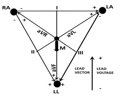 Consider the Einthoven's triangle of frontal ECG for the 3 electrodes RA, LA and LL shown in the figure. The augmented lead vectors bisect the bipolar lead vectors. At the peak of R wave, the cardiac vector M points vertically downwards with |M| = 5 mV.