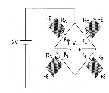 A catheter based arterial blood pressure measurement device uses a flexible diaphragm mounted with four identical strain gauges in a Wheatstone bridge configuration as shown in the figure. Assume that the strain gauges have a nominal resistance value of RG = 10 kΩ, Gauge Factor G = 40 and Young's Modulus E = 10 MPa. Blood pressure variations results in small finite change in strain ε (ε>0).