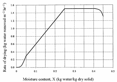A batch of 120 kg wet solid has initial moisture content of 0.2 kg water/kg dry solid. The exposed area for drying is 0.05 m2/kg dry solid. The rate of drying follows the curve given below.