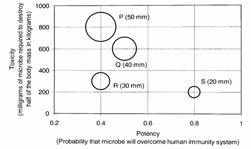 P, Q, R and S are four types of dangerous microbes recently found in a human habitat. The area of each circle with its diameter printed in brackets represents the growth of a single microbe surviving human immunity system within 24 hours of entering the body. The danger to human beings varies proportionately with the toxicity, potency and growth attributed to a microbe shown in the figure below: