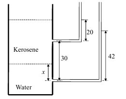 A vertical cylindrical vessel has a layer of kerosene (of density 800 kg/m3) over a layer of water (of density 1000 kg/m3). L-shaped glass tubes are connected to the column 30 cm apart. The interface between the two layers lies between the two points at which the L-tubes are connected. The levels (in cm) to which the liquids rise in the respective tubes are shown in the figure below.